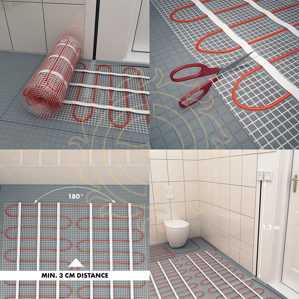 Sady jsou vhodné pro dodatečnou instalaci (rekonstrukce), ale i do nových aplikací. Díky oboustranným lepícím páskám na topné rohoži je montáž velmi snadná. Rohož je vybavena jedním přípojovacím (netopným) kabelem o délce 3 m.