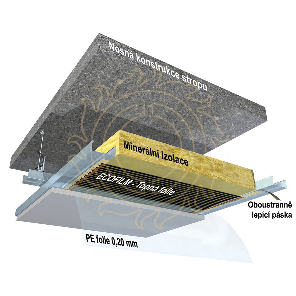 Folie jsou standardně napájeny síťovým napětím 230 V. POZOR, při stropním vytápění je vyžadováno zavěšení podhledu na tzv. pružinové (pérové, drátěné) závěsy. Přímé závěsy omezují dilataci podhledu, proto se NEDOPORUČUJÍ.