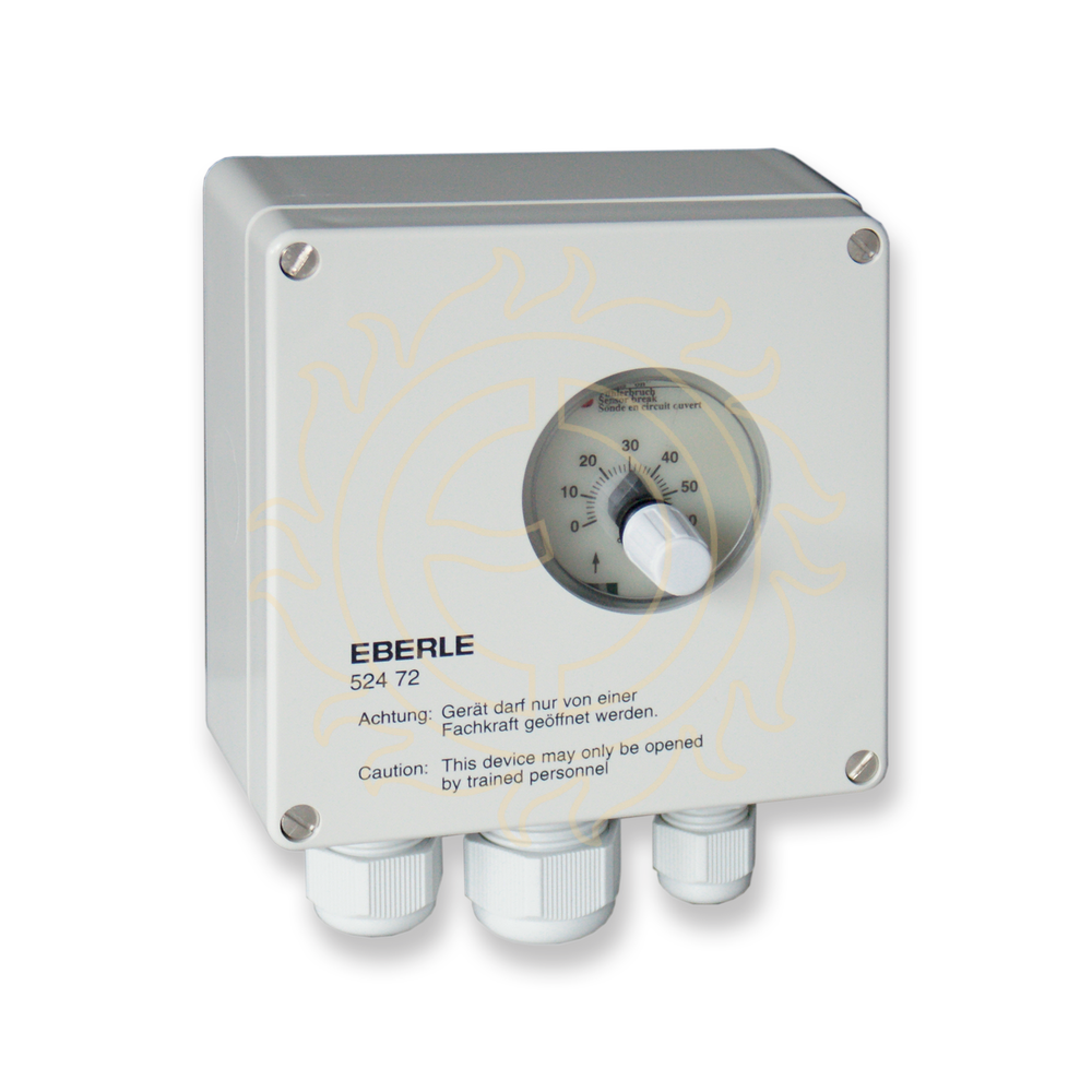 Elektronický termostat EBERLE UTR 524 72 s oddělenou kabelovou sondou (teplotní čidlo). Nastavitelná hystereze, mimo kontrolky chodu i signalizace přerušení čidla. Umístění na zeď.
