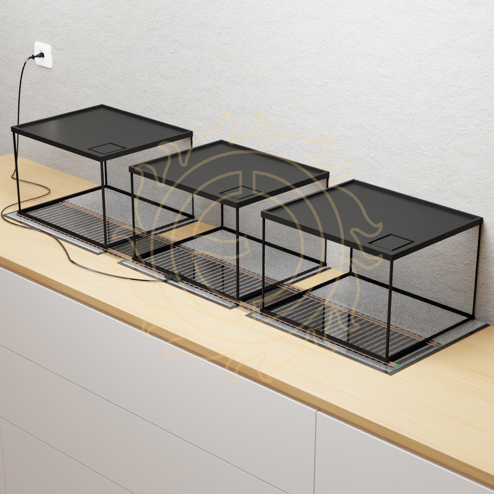 POZOR: Pokud je vytápění provozováno bez dozoru, musí být teplota omezena vhodným termostatem se sondou umístěnou ve středu vytápěné plochy! Teplota nesmí přesáhnout hodnotu požadovanou jednotlivými druhy chovaných zvířat, maximálně však 60 °C. U folií umístěných pod nádrží je důležité zajistit dostatečný odvod tepla - pozor např. na výšku a složení substrátu na dně.