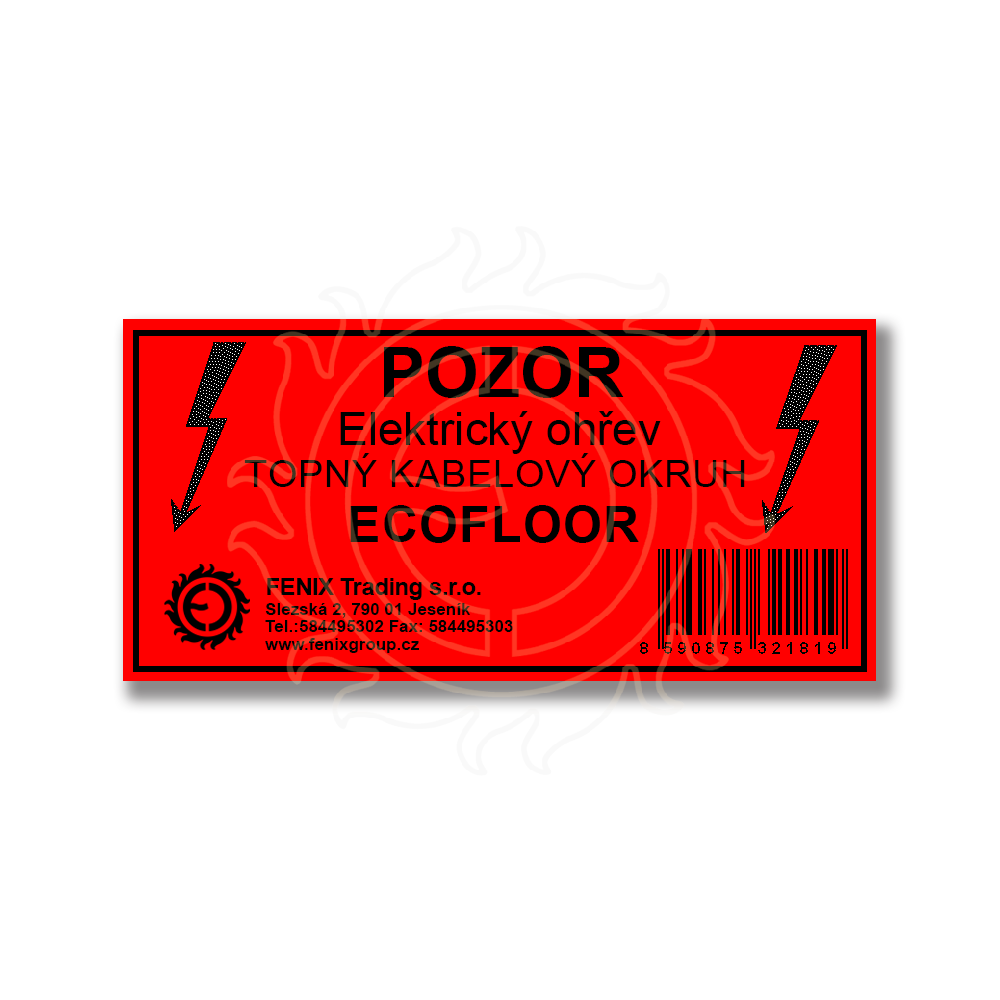 Samolepicí, otěruvzdorný plastový štítek červené barvy, se používá k bezpečnostnímu označení zařízení chráněného elektrickým topným kabelem - například protimrazová ochrana potrubí, ohřev střešních okapů a svodů apod. Velikost štítku je 100 x 50 mm.