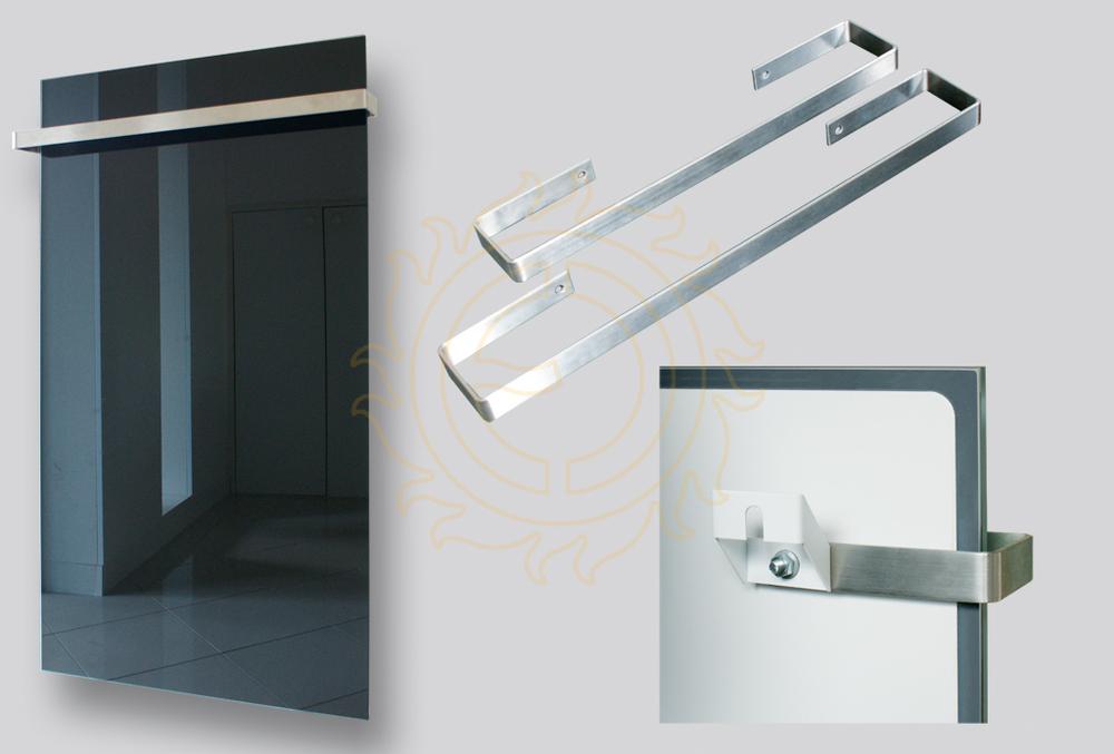 Madlo z nerezové oceli je funkčním doplňkem ke skleněným sálavým panelům GR. Jeho instalací se standardní panel změní v elegantní koupelnové topidlo s předsazeným madlem, na které lze zavěsit ručník nebo osušku. Takto upravený panel lze instalovat pouze na výšku. Montáž je snadná – otvory v zadní části madla se jednoduše nasunou na horní dva šrouby panelu, za které bude topidlo připevněno ke stěně. Panel se umístí do připravených závěsných konzol a dotažením fixačních matic je zajištěno jeho pevné uchycení. Předsazení madla od čelní skleněné desky je 60mm. Tato madla lze instalovat i na panely MR, kvůli větší tloušťce panelu bude ale předsazení před čelní deskou pouze cca 40mm. Madlo je široké 530mm, rozteč fixačních otvorů 260mm.