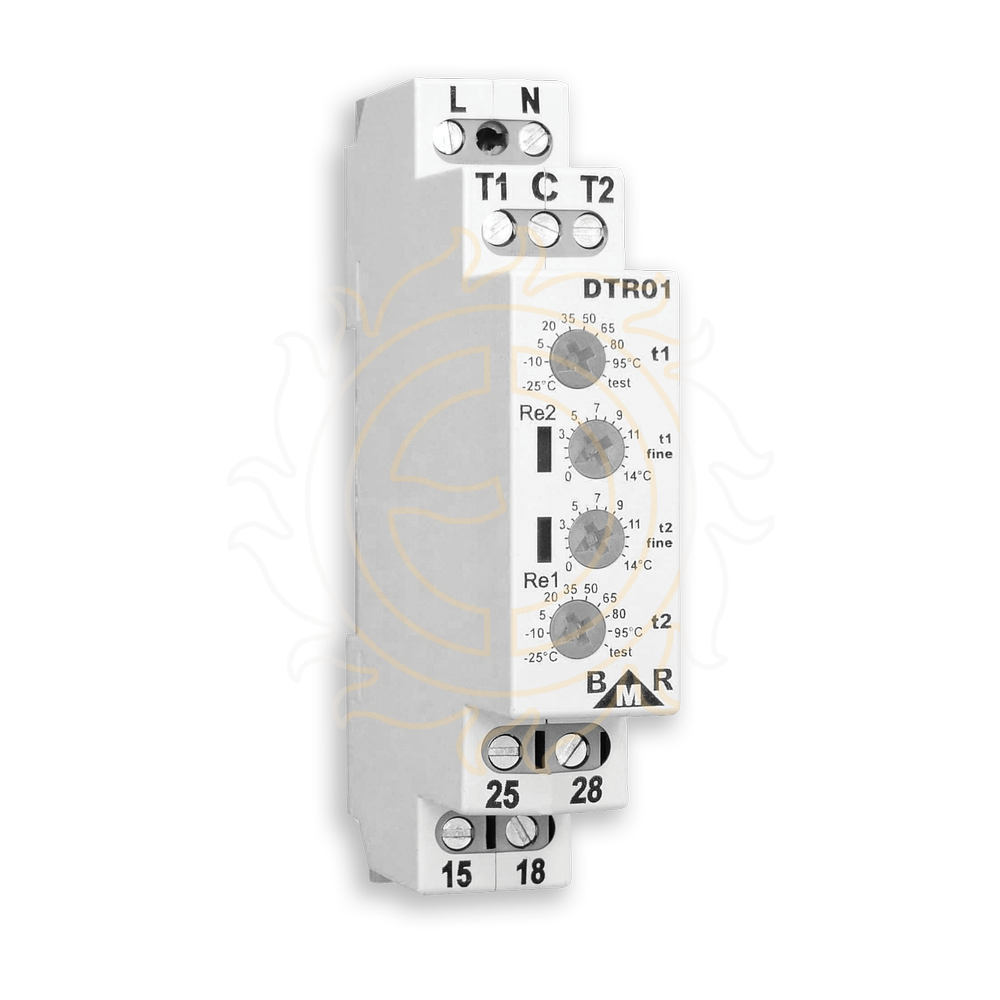 Dvoukanálový termostat udržuje nezávisle pro oba kanály nastavenou referenční teplotu s hysterezí 2 °C. Signalizace provozního stavu pomocí LED. Umístění na DIN lištu (1 modul). Součástí termostatu jsou dvě kabelové sondy BMR RT-P délky 3m (čidlo NTC 3k3). Prodloužení čidla je možné kabely SEKU 2x0,8 nebo SYKY, SYKFY 3x2x0,5. Souběhy se silovými vodiči jsou povoleny, stínění se nevyžaduje. Termostat lze použít i jako jednokanálový (druhý kanál nezapojen).